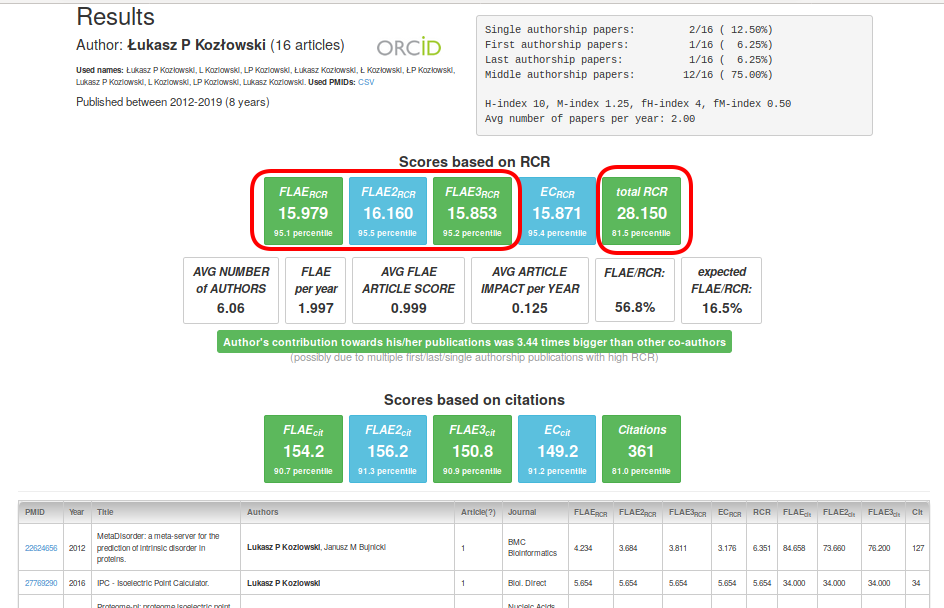 Next, we move to the central and the most important part. Panels based on RCR and citations are very similar in meaning, and they present five scores. FLAE, FLAE2, FLAE3 are the most important metrics that reflect the influence of the author (without other authors contribution). The EC score assumes equal contributions (simply the RCR sum divided by the number of authors). Total RCR is a sum of all RCR scores in the portfolio (regardless of whether the item has one or one hundred authors). Note that increasing total RCR (or citations) can be done relatively easily (for instance, by increasing the group size, participation in consortia, etc.). However, it is extremely difficult to increase FLAE scores.