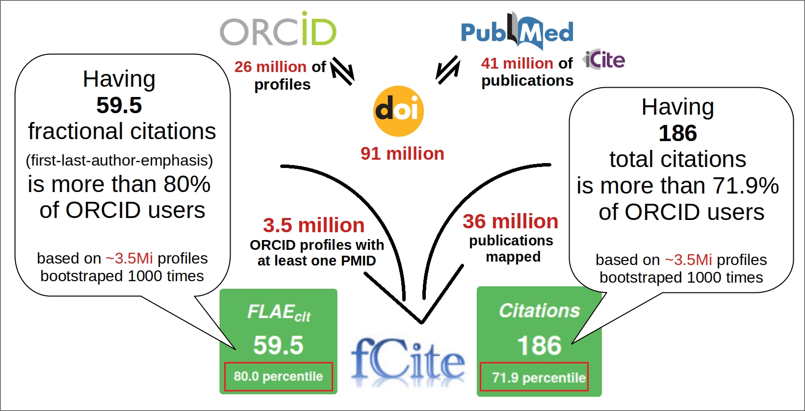 Total number of the citations, RCRs and and their fractional counterparts (FLAE, FLAE2, FLAE3, EC) are compared to ~770k reaserchers and 9.97Mi publications from ORCID.